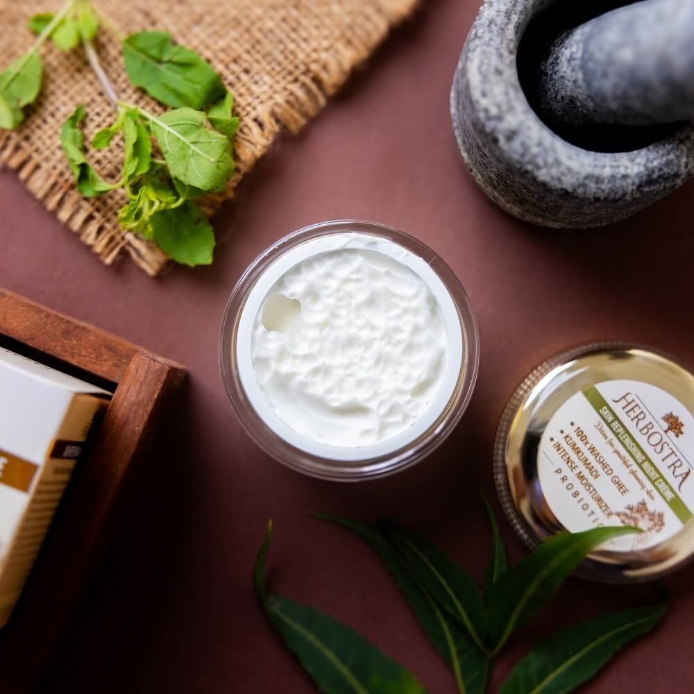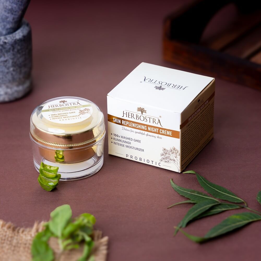 Skin plays an important aesthetic role in making you look young and beautiful. However, with age, the skin suffers from both intrinsic and extrinsic aging factors that also weakens the protective barrier. Herbostra Skin Replenishing Night Crème is a blend of natural 100x washed ghee, kumkumadi and several other ayurvedic herbs rich in anti-oxidants and anti-aging properties. This cream is enriched with Shatadhauta Ghrita or 100x washed ghee that deeply nourishes, soothes and strengthens skin's protective barrier, repairs and replenishes the skin - all while you sleep. Herbostra Skin Replenishing Night Crème helps the skin detox from visible harmful effects by environmental factors. It also helps in moisturizing, hydrating, reduce fine lines & wrinkles. It helps boost collagen and elastin production, giving skin a more youthful and fresh look. It reduces visible blemishes & pigmentation. It makes your skin look smoother, even toned and more radiant. It's an all-natural formula with no synthetic colour or fragrance.